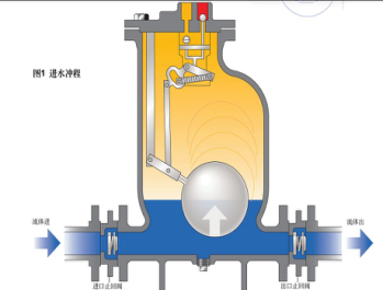 1、流體由進(jìn)口止回閥進(jìn)入泵體,使浮球升起。
