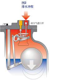 2、泵體內(nèi)殘余的未冷凝氣體由開(kāi)啟的廢氣口排出,(如圖1)當(dāng)泵體內(nèi)充滿(mǎn)水后,閥門(mén)翻轉(zhuǎn)機(jī)構(gòu)動(dòng)作,打開(kāi)動(dòng)力氣進(jìn)口閥,同時(shí)關(guān)閉廢氣閥,(如圖2)該快速翻轉(zhuǎn)動(dòng)作確保泵從進(jìn)水沖程向排水沖程的迅速轉(zhuǎn)換。